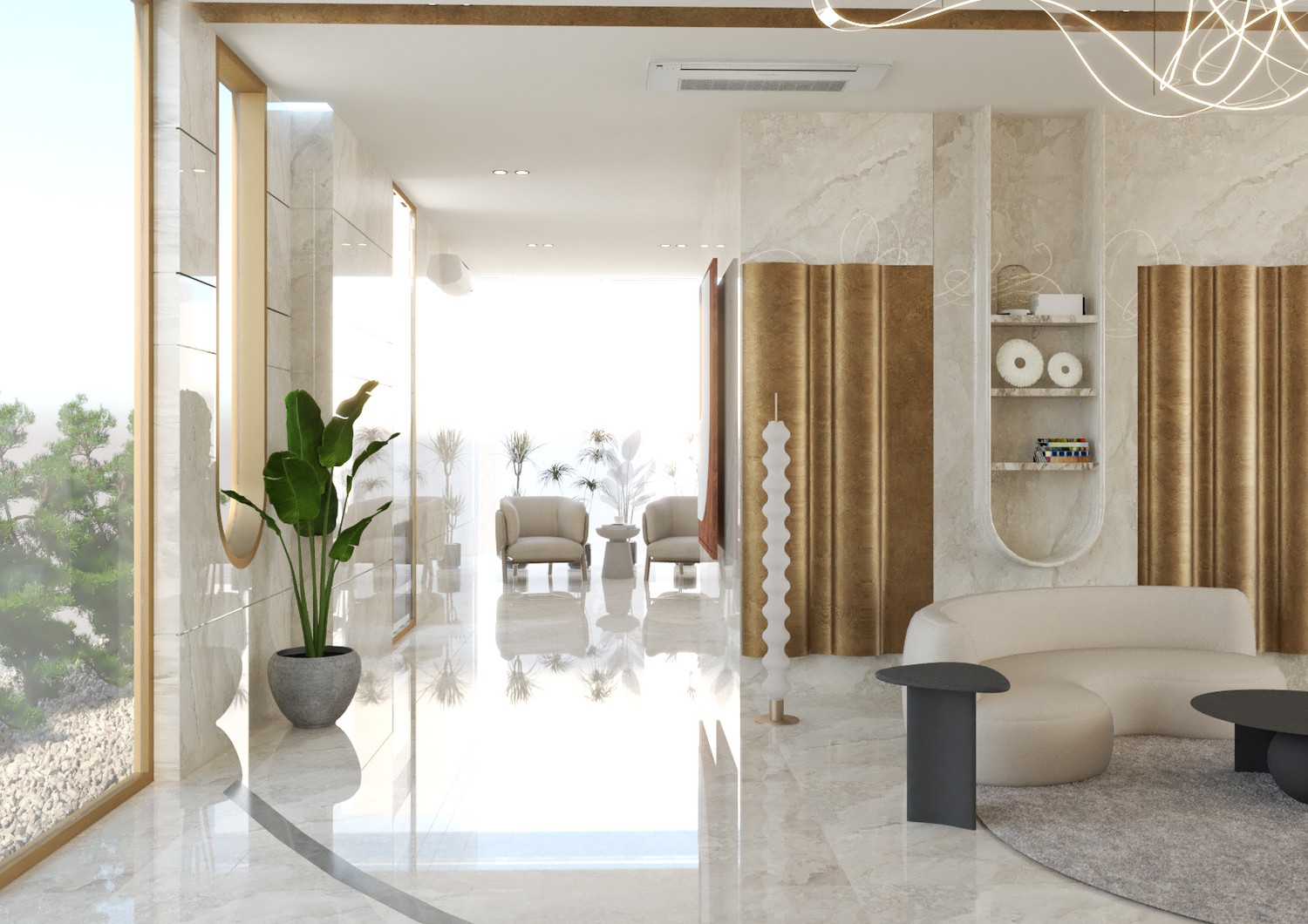 This stunning lobby is a testament to luxury, designed with meticulous attention to detail. Accentuated by elegant marble, intricate inlay work, and gold panels, the space exudes opulence while maintaining a minimalistic aesthetic. It features a cozy library for quiet reflection, formal seating areas for gatherings, and a sleek reception desk that welcomes guests with sophistication. This lobby is not just an entrance; it’s an experience of refined elegance.