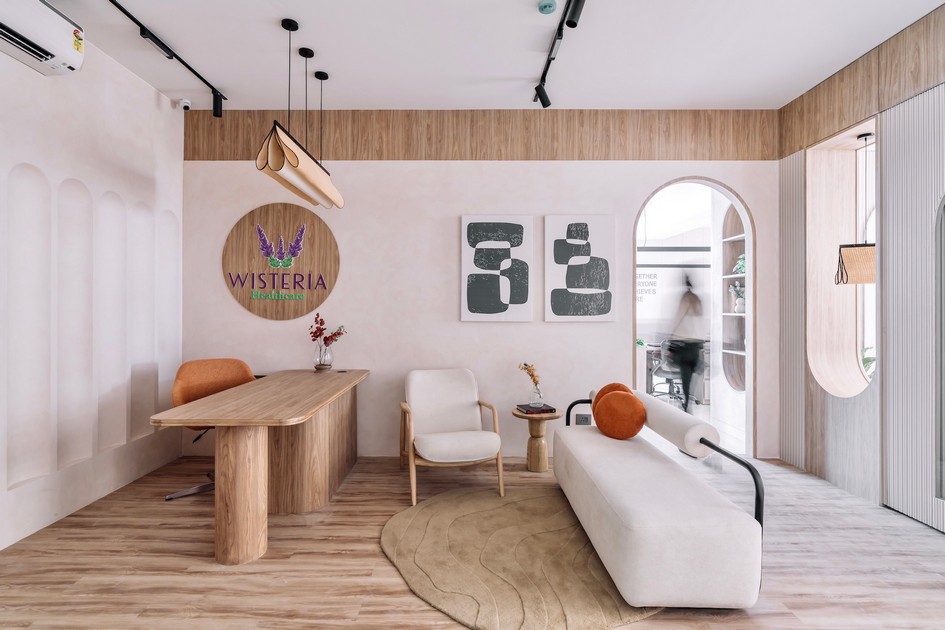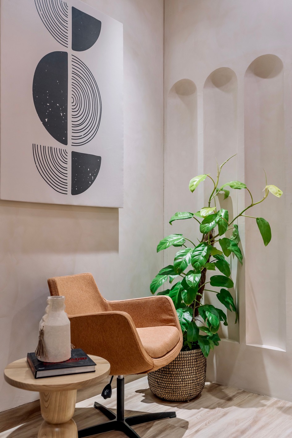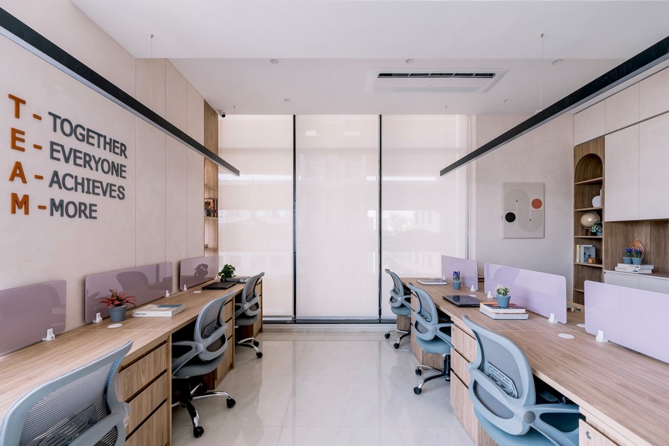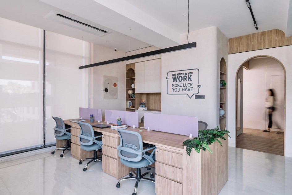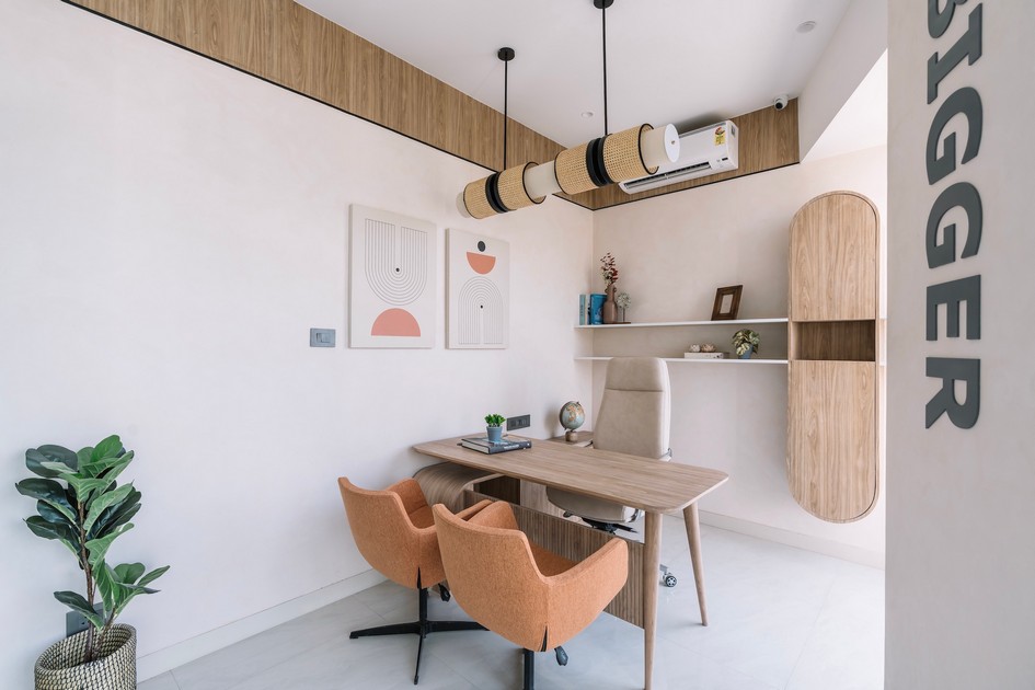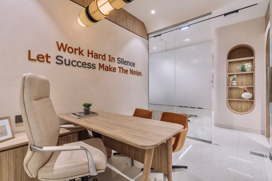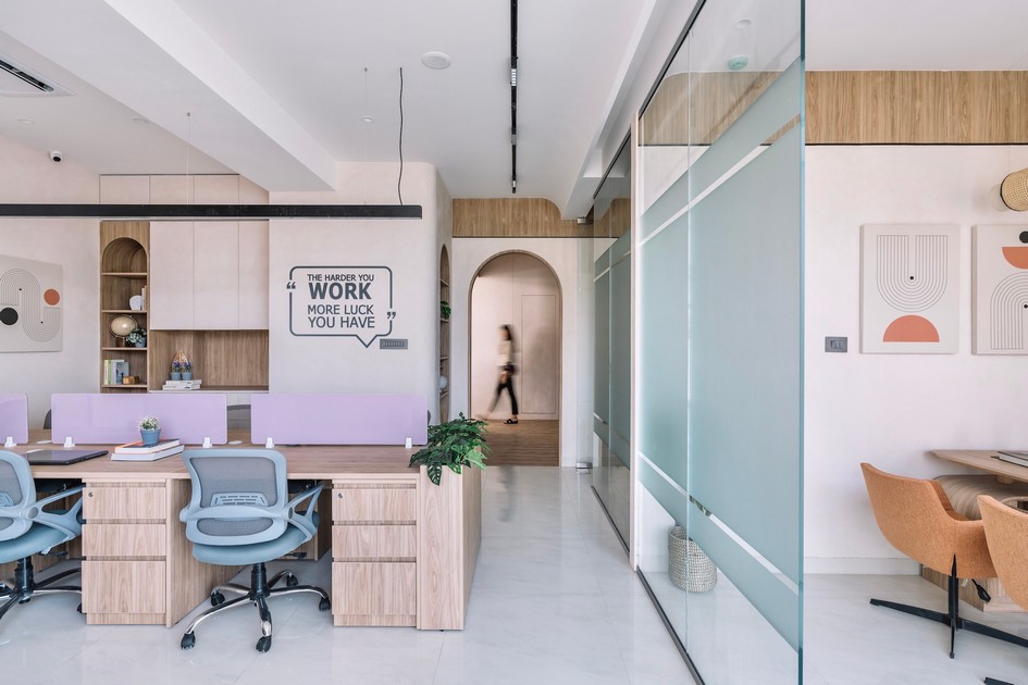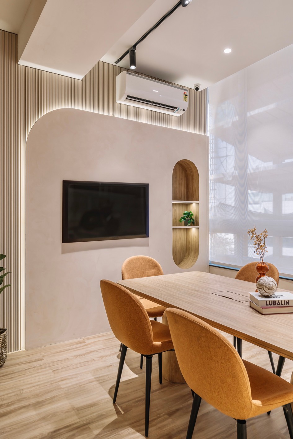 Inspired by a capsule,this pharma company’s workspace looks so chic!The arched elements depicting a capsule and vibrant colors create a stimulating environment for creativity and productivity.From the ergonomic furniture to the innovative lighting,every detail is thoughtfully designed.The meticulous use of wood and earthy tones creates an atmosphere that fosters productivity and tranquility.A true testament to the marriage of aesthetics and functionality.